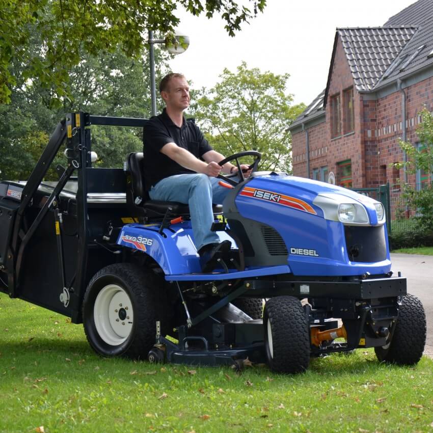 Iseki SXG 323 -122cm zitmaaier met grasopvang onder natte omstandigheden, ideaal voor bladopvang